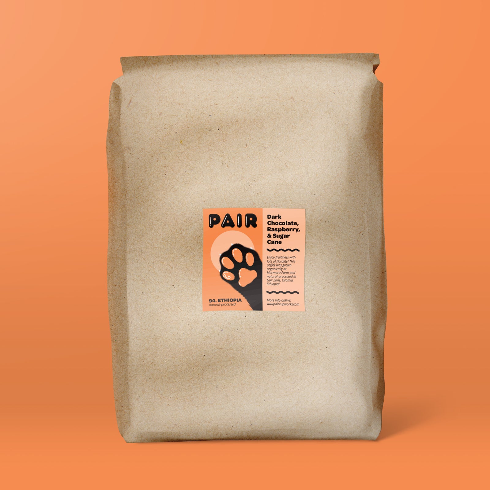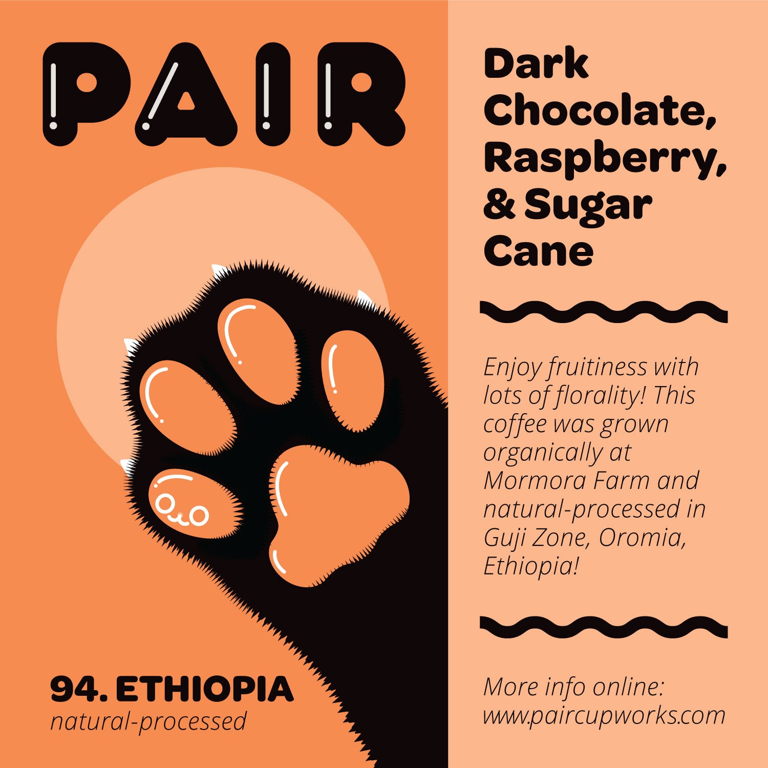 Dark Chocolate, Raspberry, & Sugar Cane -- Enjoy fruitiness with lots of florality. This coffee was grown organically, shaded by forest canopy at Mormora Farm, and natural-processed in Guji Zone, Oromia, Ethiopia! We love this coffee for its classic natural Ethiopia flavor profile. It's presenting more towards the fruity and sweet side with medium acidity, and not fermenty at all.